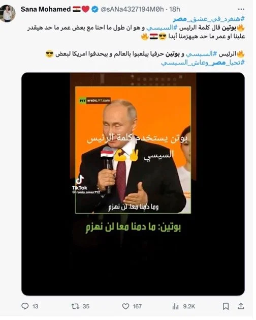 - Russian state media channels, particularly Sputnik and RT Arabic, are utilized to disseminate these narratives, leveraging their large following base in Egypt.